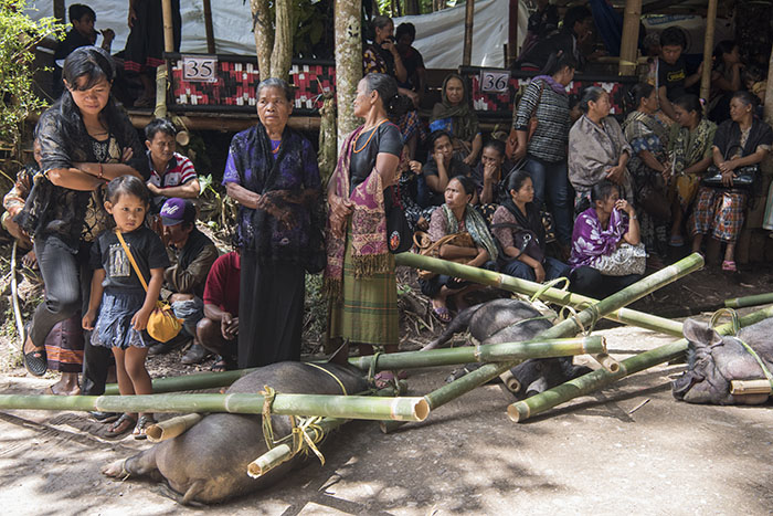 スラウェシ島、South Sulawesi地方、Tana Torajaの葬式の風景。参列者たちと持ち寄られた豚。トラジャ族富裕層(貴族)にとって葬儀は非常に重要であり、時間をかけて贅をつくした式が行われる。