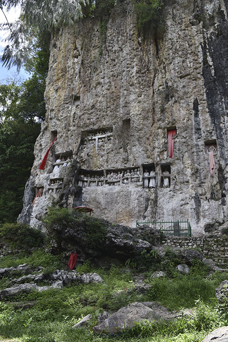 スラウェシ島、South Sulawesi地方、Tana Toraja。Suayaの岩壁に掘られた墓。トラジャではかつて厳格な身分制度があり、貴族はこうした岩をくりぬいて掘った石室に埋葬した。