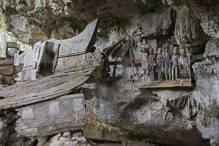 スラウェシ島、South Sulawesi地方、Tana Toraja。Suayaの洞窟に安置された棺と人形。