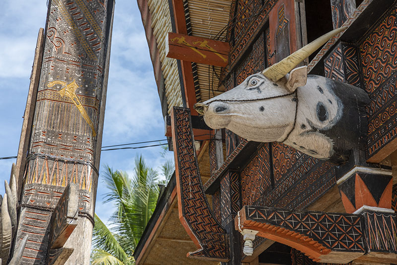 スラウェシ島、South Sulawesi地方、Tana Toraja。伝統的な様式の家屋(トンコナン)の装飾と水牛の木彫。