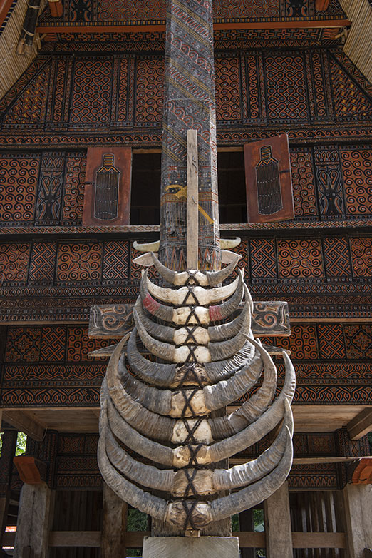 スラウェシ島、South Sulawesi地方、Tana Toraja。伝統的な様式の家屋(トンコナン)の正面に飾られた水牛の角。