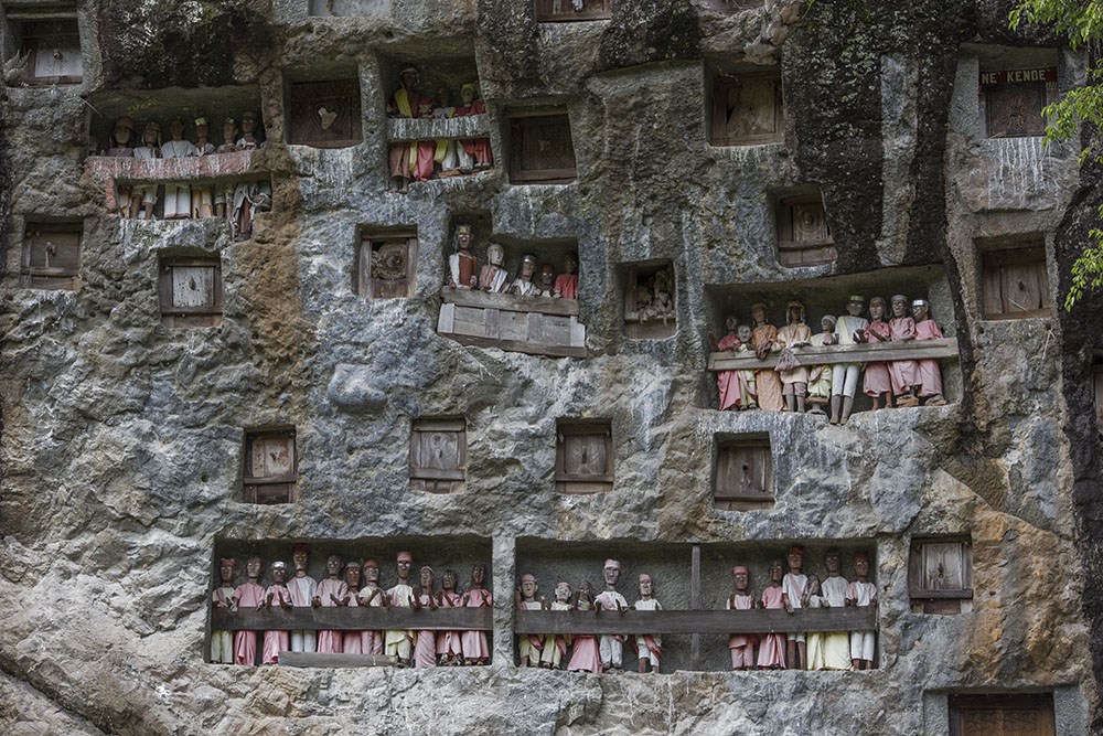 スラウェシ島、South Sulawesi地方、Tana Toraja。Lemoの岩壁に作られた墓と人形(タウタウ)。