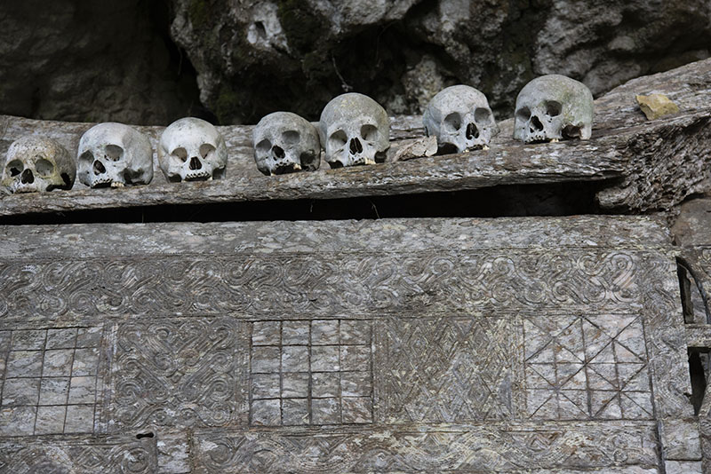スラウェシ島、South Sulawesi地方、Tana Toraja。Kete Kesu村の墓地にある古い木製の墓と骨。