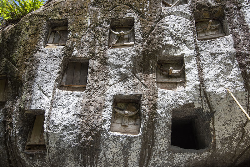 スラウェシ島、South Sulawesi地方、Tana Toraja。Boriの巨岩を掘り抜いた墓。 墓の扉には水牛の彫り物がついている。