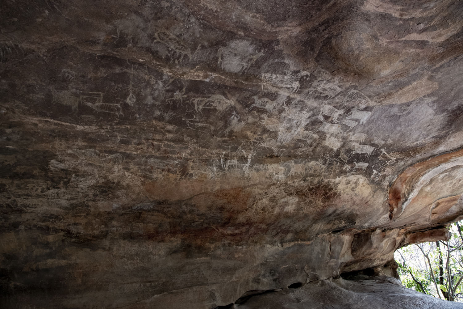シェルター4の壁画。幅14メートル、高さ6メートル以上ある。約250の16種の動物が描かれているため、「Zoo Rock」というあだ名がついている。白いラインで描かれた動物は中石器時代、下方に赤い色で描かれたものは歴史時代(古代)のものとされている。