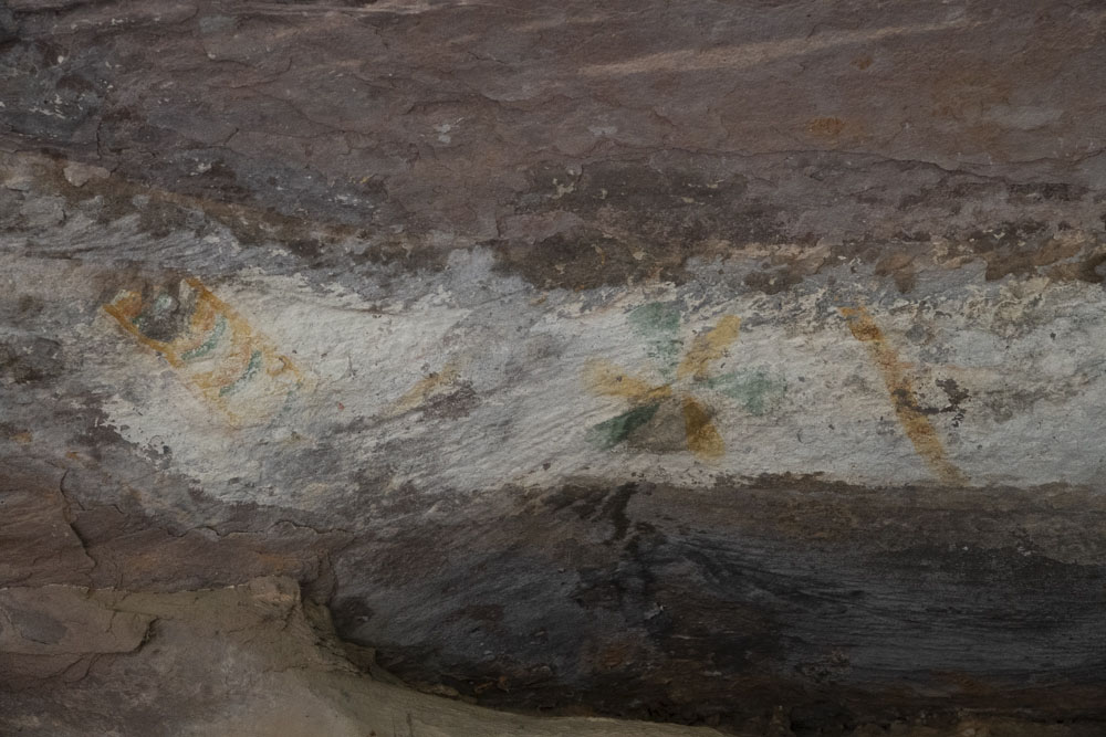 シェルター9の壁画。黄色と緑色が鮮やかに残っている。