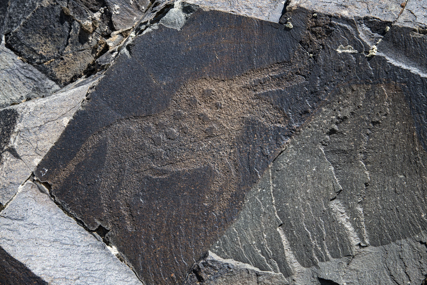 タンバリ。グループ IIの壁画。牡牛。青銅器時代の刻画は繊細にペッキングして描かれていて、このように模様をきれいに丸く残すようなこともできている。