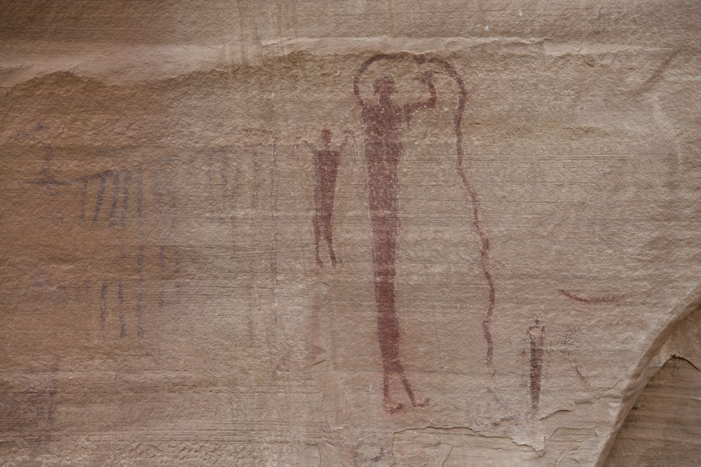 バックホーン・ウォッシュの壁画。ヘビを扱う人たち。左の人物はすだれ状のものを持っているが、これもヘビかもしれない。