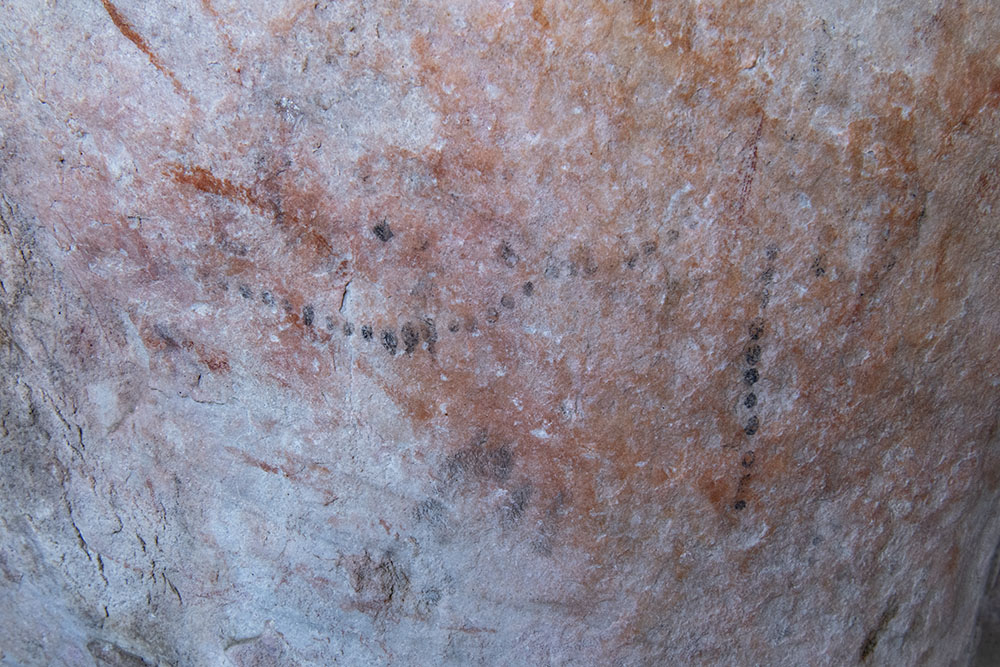 トゥルイジェスクラール、2番目の駐車場近くのサイトの絵。指先でつけられたドット。指で描くのは主にコイコイ人のものと考えられている。