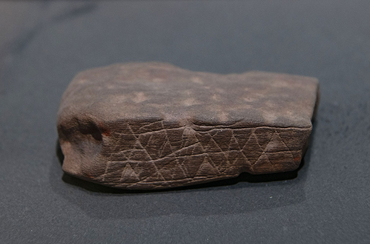 ケープタウンの東約300キロ、海岸沿いにあるBlombos洞窟で発見された人類最古の芸術的意匠として知られるオーカーの石片のレプリカ。