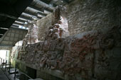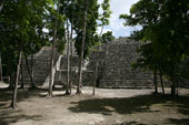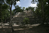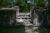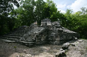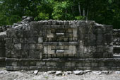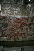 | バラムクとはマヤ語で「ジャガーの家」を意味する。カンペチェ州の南東部にある都市で、前古典期から古典期末期まで、かなり長く栄えたとみられる。カラクムルのある広大な自然保護区の周縁部分にあるため、遺跡内ではホエザル、クモザルなどの野生動物を頻繁に見ることができる。都市の規模はさほどでもないが、1990年、神殿内部に非常に保存状態の良い、見事な漆喰彫刻が発見された。外壁に覆われていたため、彩色も鮮やかに残るものだが、モチーフも非常にユニークなものだ。遺跡の名は、この漆喰彫刻の中にジャガーの像が一対残っていることに由来する。訪問した際にきちんと記録を遺していなかったので、建物の位置関係など、よくわからなくなってしまった。間違いがあるかもしれない。 |