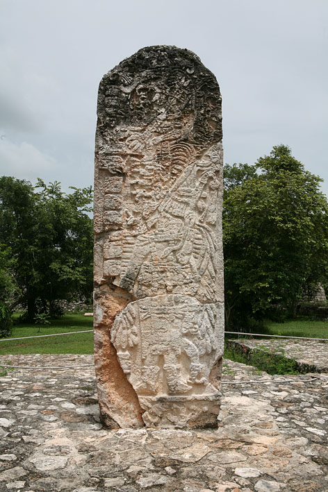 「楕円の宮殿」の隣に建つ日本の石碑のひとつ。統治者Ukit Jol Ahkulの姿を刻んだもので、マヤ文字も残っている。2007年撮影。