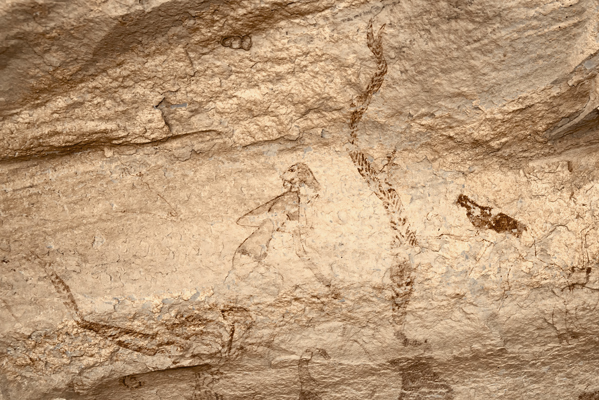 タッシリ・ナジェール、ウーマシIの壁画。象狩りの場面の人間たち。ふり返る男の左右に細長いヘビのようなものが見えるが、左は倒れている男の足、右は手を高く上げて何か武器を投げようとしている男。